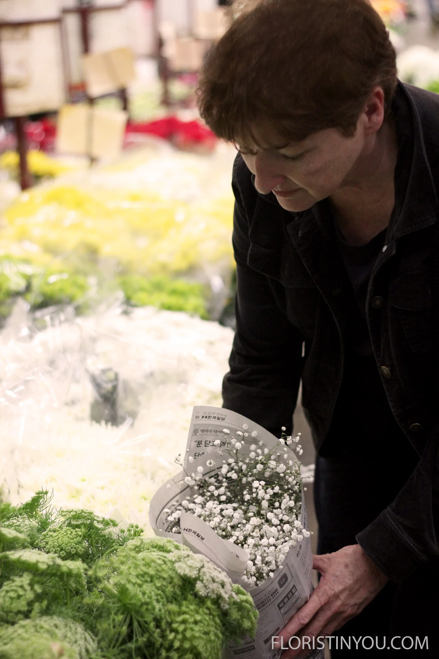 When you select the flowers you want, either someone will come over and take them to the wrapping counter for you, or you can take them to the wrapping counter. They will wrap them in newspaper and tie them with string. You can carry the bundles, or if you have ordered a lot from one vendor, they may send someone with you to your vehicle. If they do, tip the guy.