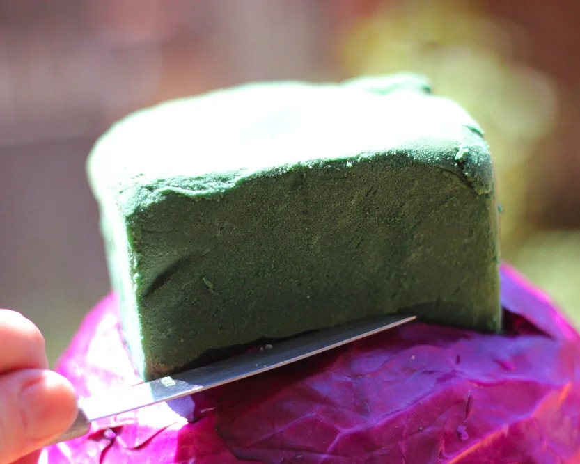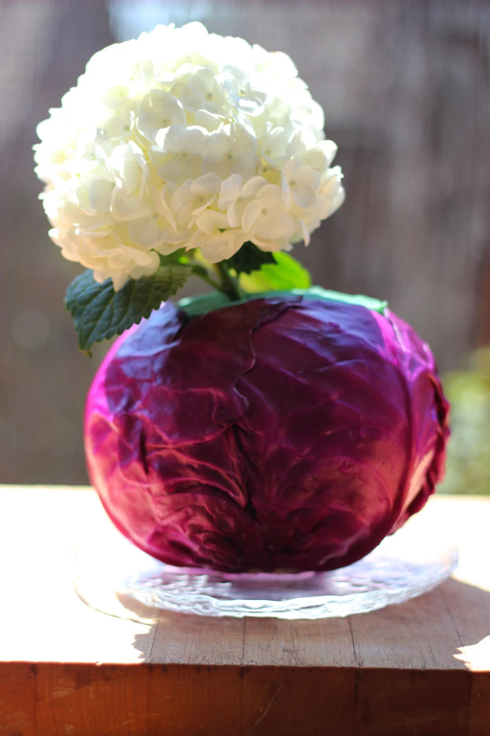 This is a relatively easy arrangement to make. The difficulty lies in cutting the rectangle to fit the shape of your floral foam and removing the cabbage without cutting the sides off or cutting all the way through the bottom of the cabbage. Cutting the lines of the rectangle through the center of the cabbage and hollowing out the rectangle will require some muscle power, and also control, so that you don't slice the knife through the edge of the cabbage! Well, make you shopping trip, gather your tools, and lets begin making this garden centerpiece adventure.