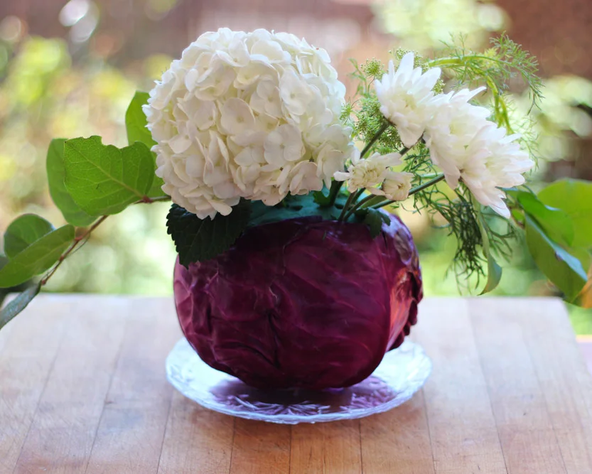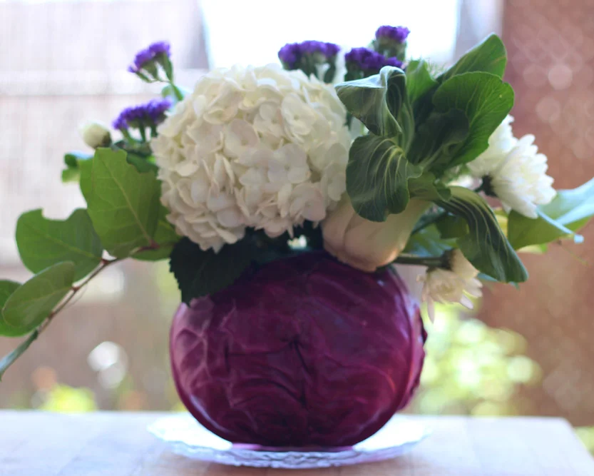 You can find a regular purple cabbage and small Chinese cabbages from a grocery store. You might have to go to a grocery store that carries a wide variety of produce for the miniature eggplants. The flowers used were from a fall bouquet. You might be able to find all of the flowers you need in one bouquet, or you may have to buy a bouquet and supplement with others. I used one white hydrangea in the front. It would have been nice to have 2 or 3 so you could anchor one in the back.