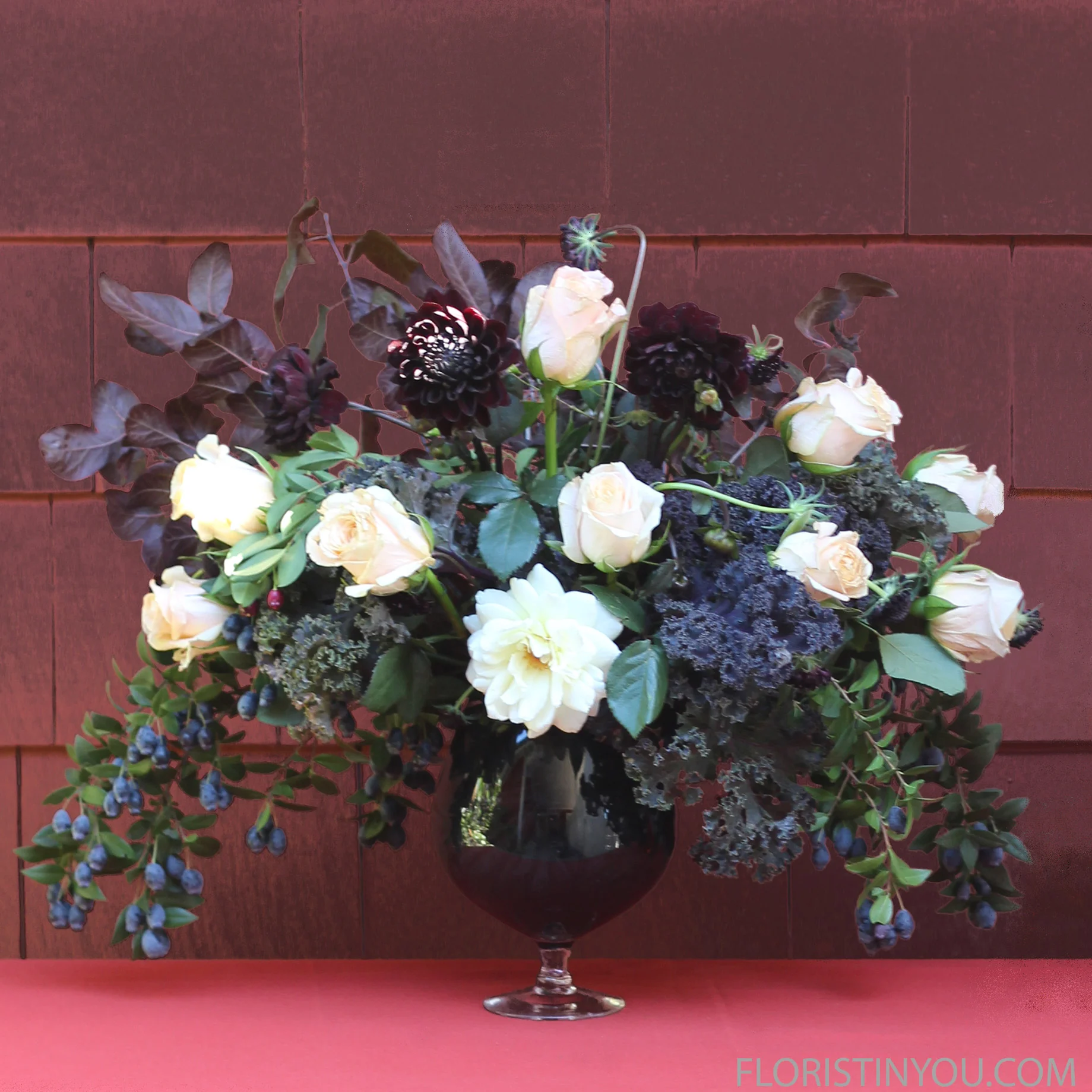 With Burgundy Black Dahlias, Black Knight Scabiosas, Redbor Kale, branches and cuttings from the yard