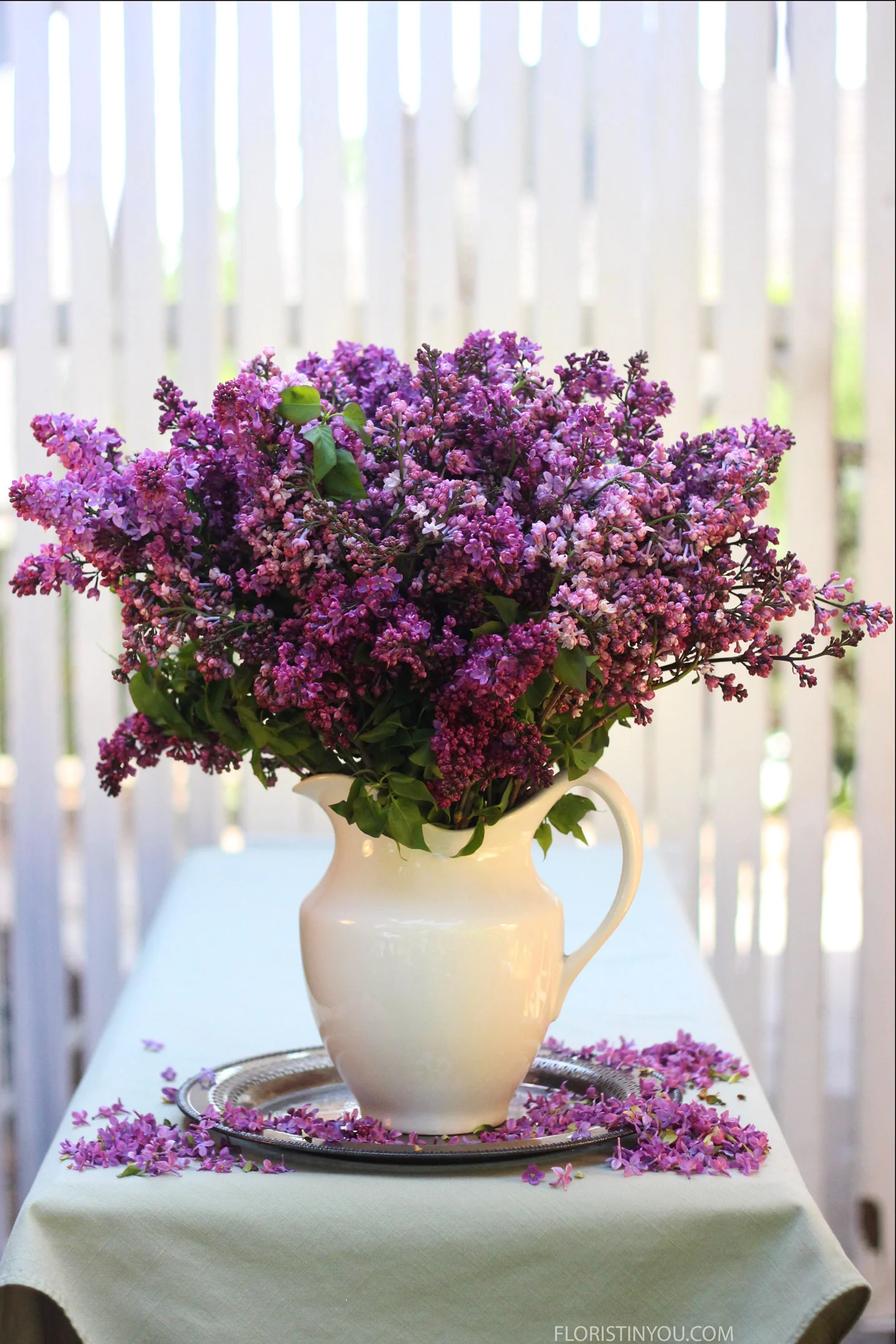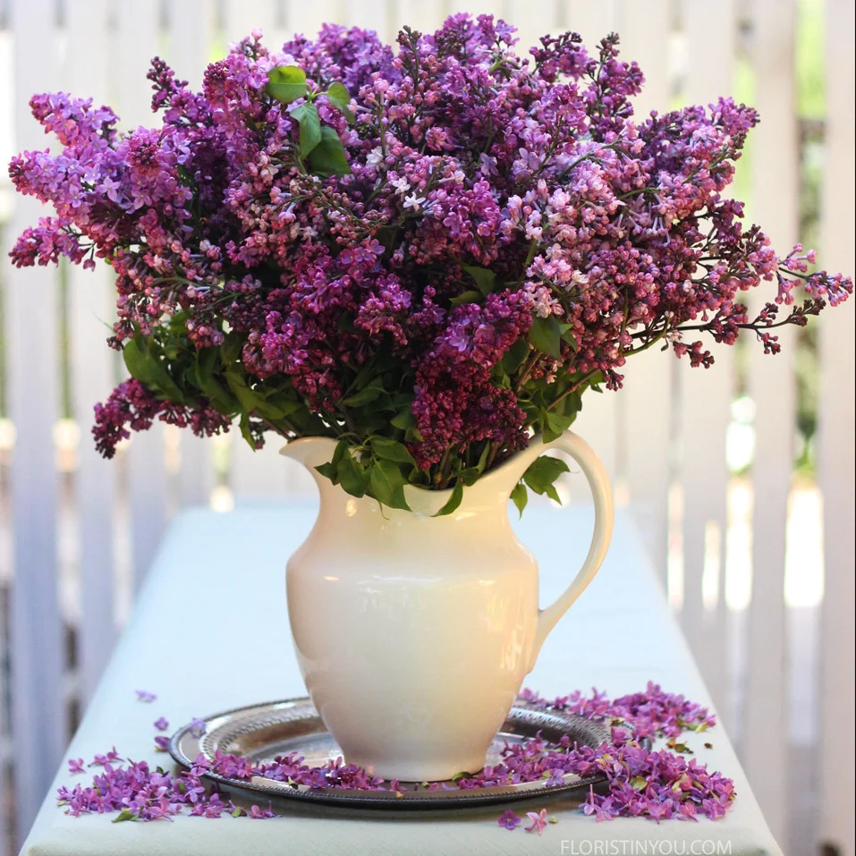 Lilacs are brought down from the higher elevations to the farmers markets around Los Angeles, and everyone is thrilled to get them. Their scientific name is 'Syringa vulgaris' and they comes from the olive family. Make sure to cut their woody stalks when you bring it home so they can stay hydrated. If you have your lilacs and a white pitcher, you are ready.